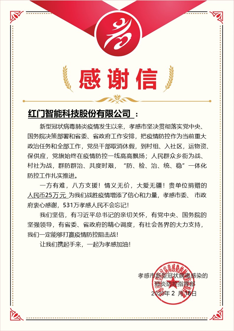 “仁爱是中华民族的传统美德,也是红门人的价值理念,我们将不忘初心,在这场没有硝烟的战争中,奉献自己的一份力量,为武汉加油!为中国加油!”这是一位红门人员工在捐款时的留言,也是所有红门人共同的心声!